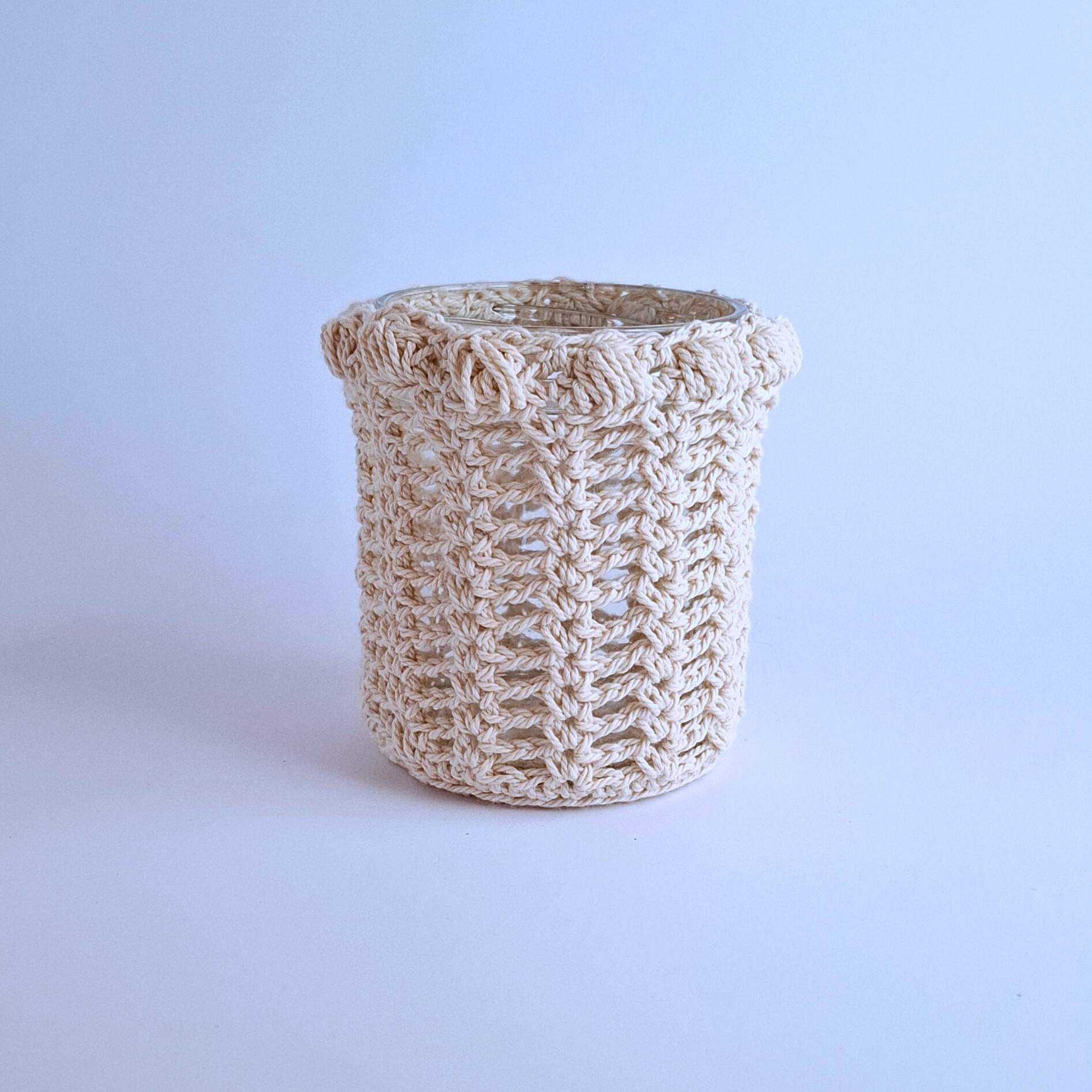 Kézzel horgolt mécsestartó, amely pamutzsinór borítással és üvegpohárral készült. A mécses lángja szépen átszűrődik a mintákon, melegséget és hangulatot varázsolva otthonodba. Tökéletes romantikus estékhez vagy ajándéknak.